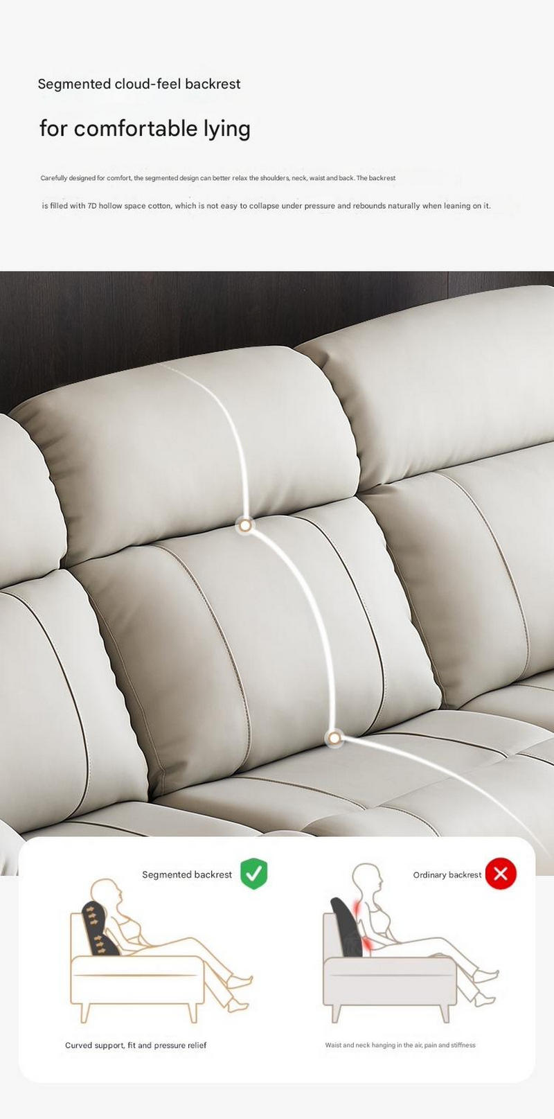 We start with strict material selection. The seat cushion is filled with 55D high - density sponge, adopting honeycomb micro - porous sponge technology. It is not only soft and highly resilient, durable, but also has passed the international SGS certification, being green, environmentally friendly, and formaldehyde - free, far exceeding the 25D density standard of ordinary sponges in the market. The backrest is filled with 7D hollow space cotton, which is not easy to collapse under pressure and can naturally rebound after being leaned on. The segmented design can precisely relax the shoulders, neck, waist, and back. The outer layer is made of small yellow cowhide, which is of high grade, with fewer scars. The leather is thick, flexible, durable, and tear - resistant, bringing you a "first - class cabin" sitting and leaning experience.