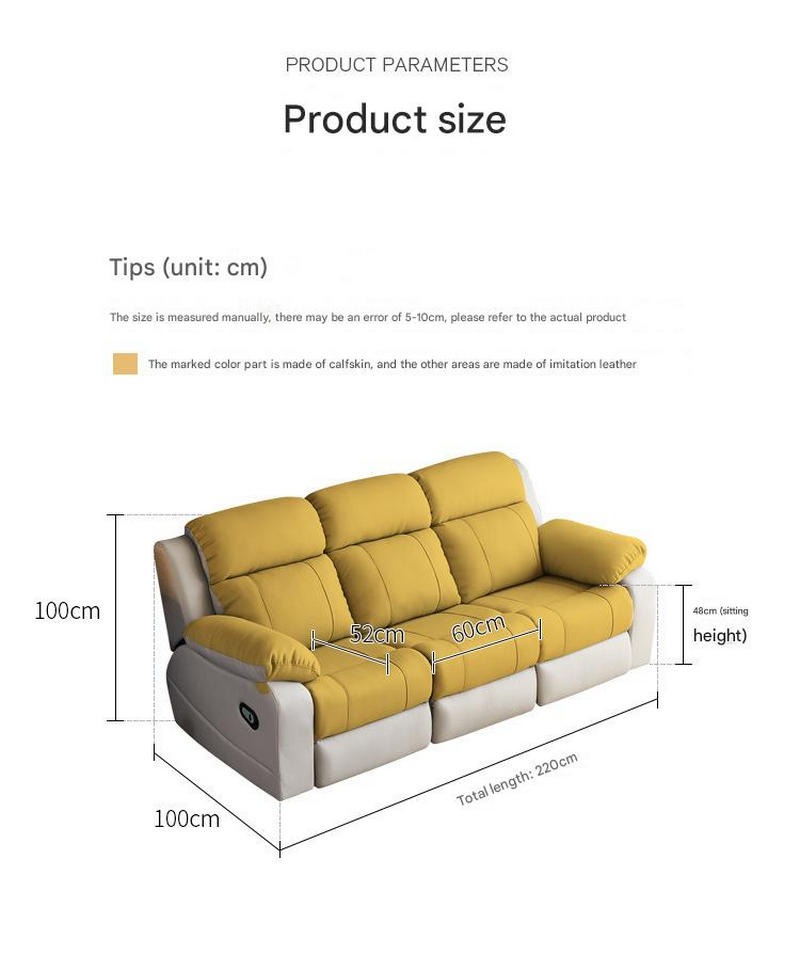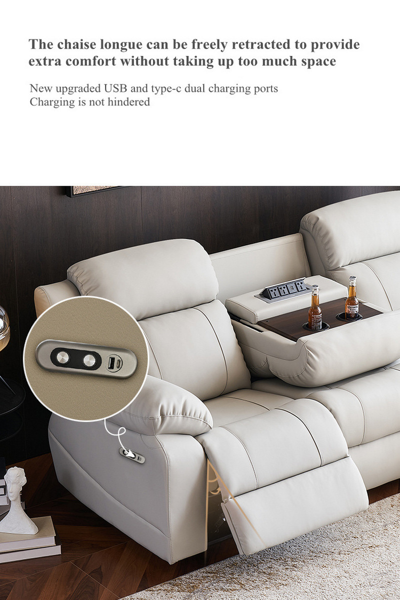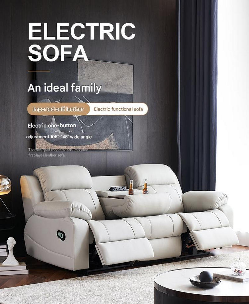 In terms of functional design, this sofa also has many highlights. With just one click, you can adjust the angle from 105° to 145°, easily controlling sitting, reclining, and sleeping postures. The electric zero - wall - hugging design allows the sofa to move forward as a whole when unfolded, and it can be placed closely against the wall, saving space. The multi - functional middle backrest can be used as an armrest, cup holder, and multi - functional socket when put down, and it turns back into a seat backrest when retracted, meeting your various needs for leisure and entertainment.
